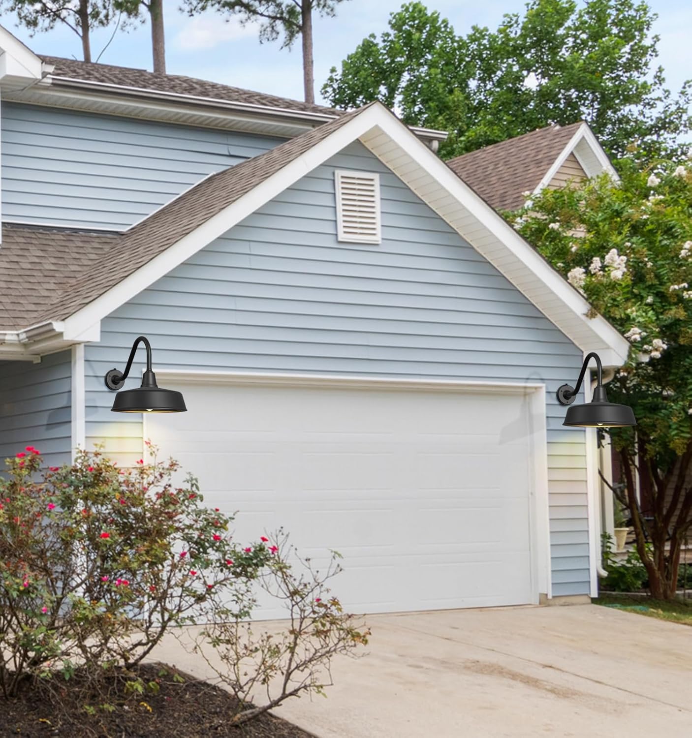 Farmhouse Gooseneck Style – Matte black finish with a curved arm and domed shade adds charm to any porch, garage, or barn.