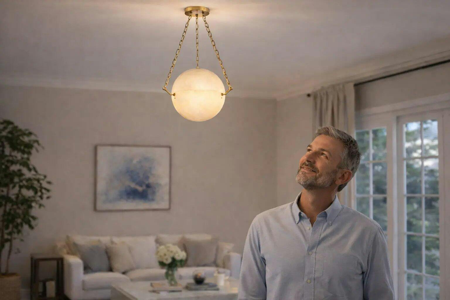 Absolutely love this pendant light! The alabaster globe gives off the most beautiful, soft glow that makes the whole room feel warm and inviting. The brass chain and hardware add just the right touch of elegance, and the craftsmanship is top-notch. It fits perfectly with our modern minimalist decor and has become the focal point of the living room. Definitely a five-star purchase!