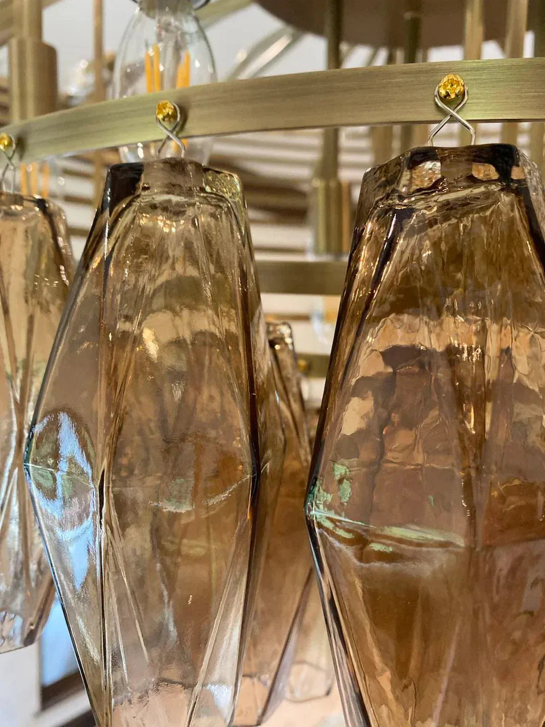 This chandelier is suspended from a tiered steel frame with dozens of hand-blown glass polyhedra on individual hooks. Illuminated from within. the faceted chandeliers dramatically reflect and refract light. A tribute to the Italian lighting style of the 1950s with this minimalist style.